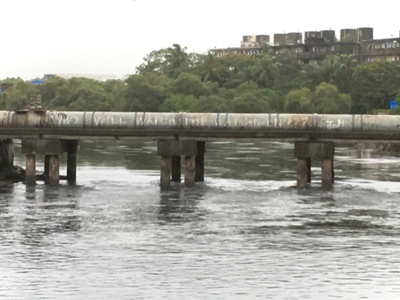 It was my first time in Bombay and I was apprehensive of this new city, one I’d only read and heard of before. I had flown in for an interview and was due back to Bangalore the very same day, so I wanted to take in as much as I could. After shedding the jacket and the airport air conditioning (what was I thinking, it was October in a coastal city), I booked a taxi to take me to Fort. Of all the things I saw along the way, these words, white against grey, on a pipeline across the Mithi river, left a lingering discomfort, aside of course, from the waves of blue tarpaulin and metal roofs beating rhythmically and starkly against the shore of the blue tinted glass skyline. The taxi was moving and so I couldn’t pull out my phone in time to snap a picture of it.