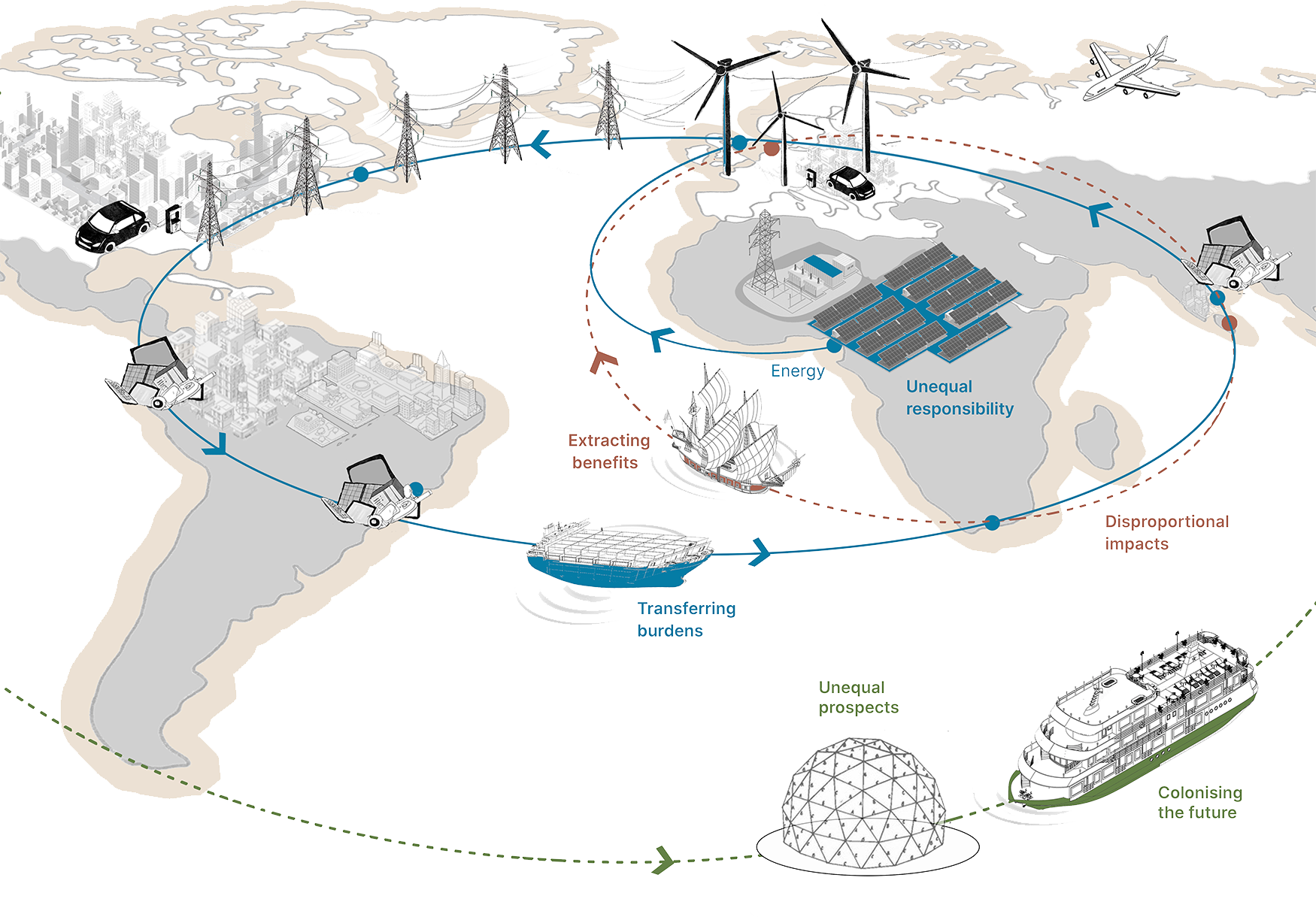 Initial sketches were collaboratively refined to challenge universalised representations. For instance, the normative Eurocentric cartographic projection was done away with, as it was antithetical to the paper’s decolonial stance. Instead, a South centered map was adopted so as to foreground colonial histories, extraction zones, and possible alternative futures.