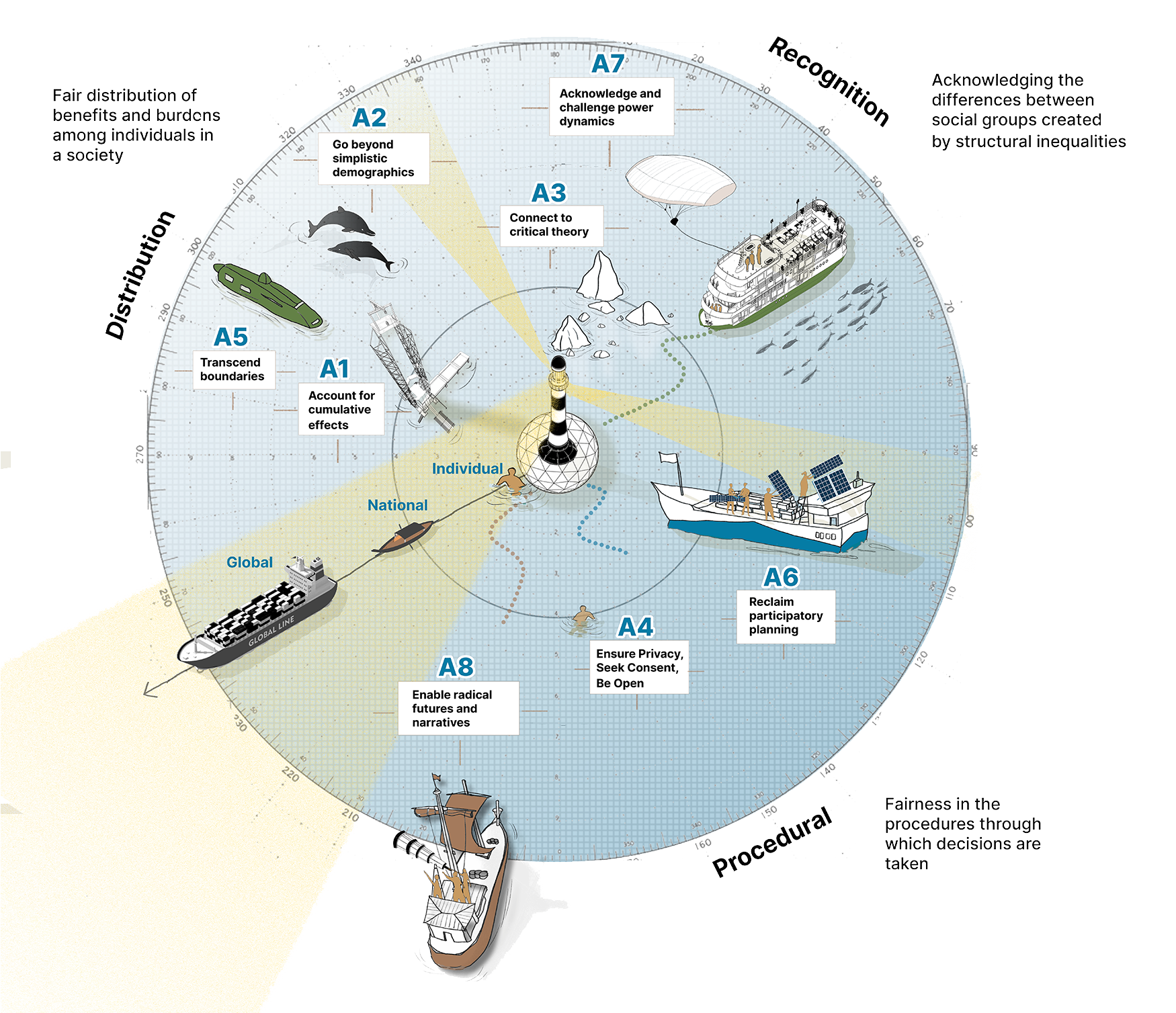 The concluding visual that represents the avenues for spatial justice in urban climate action evokes the image of a ship’s radar to represent how cities can navigate climate change through spatially just principles. Through this analogy, urban polities are shown as ships/vessels guided by the eight different principles presented in the paper. A lighthouse was incorporated to signify a universal symbol of seafaring guidance that also doubled up to clearly distinguish between the different dimensions of justice (i.e., distributive, procedural, and recognition justice).