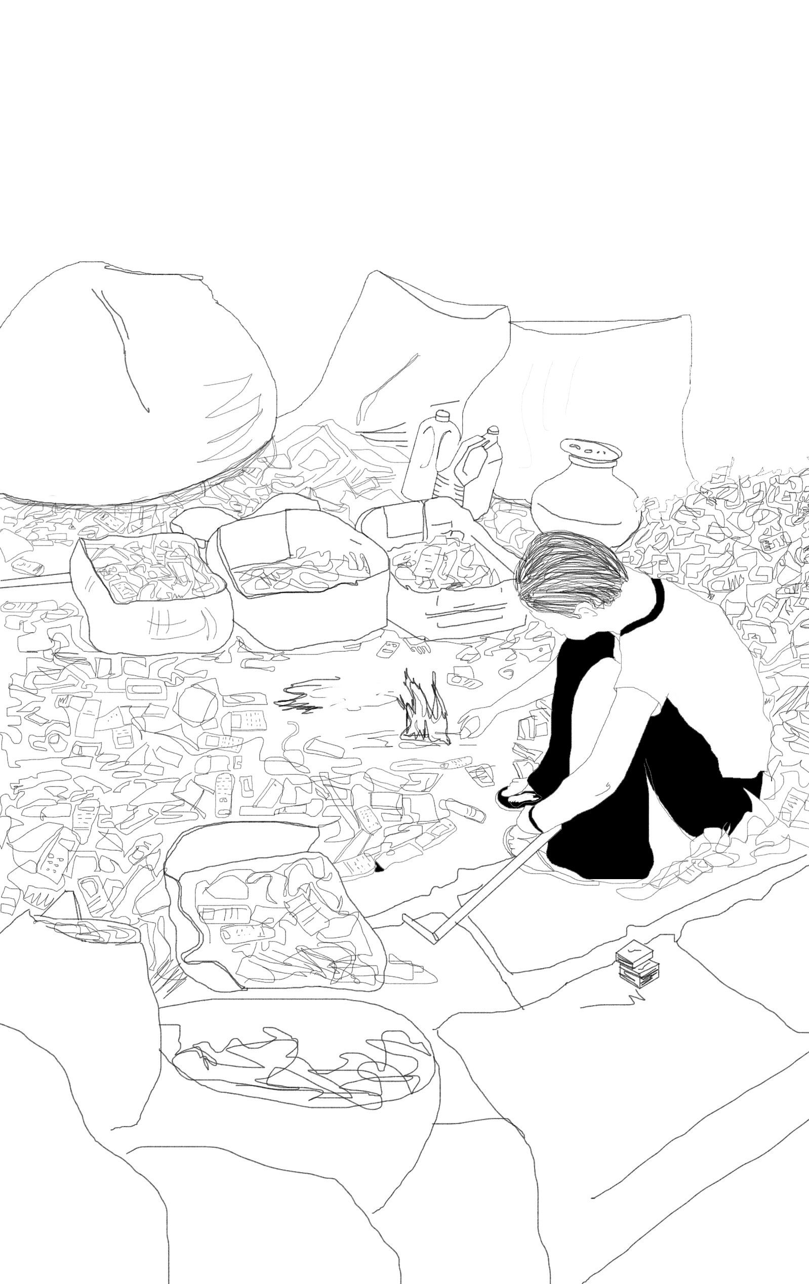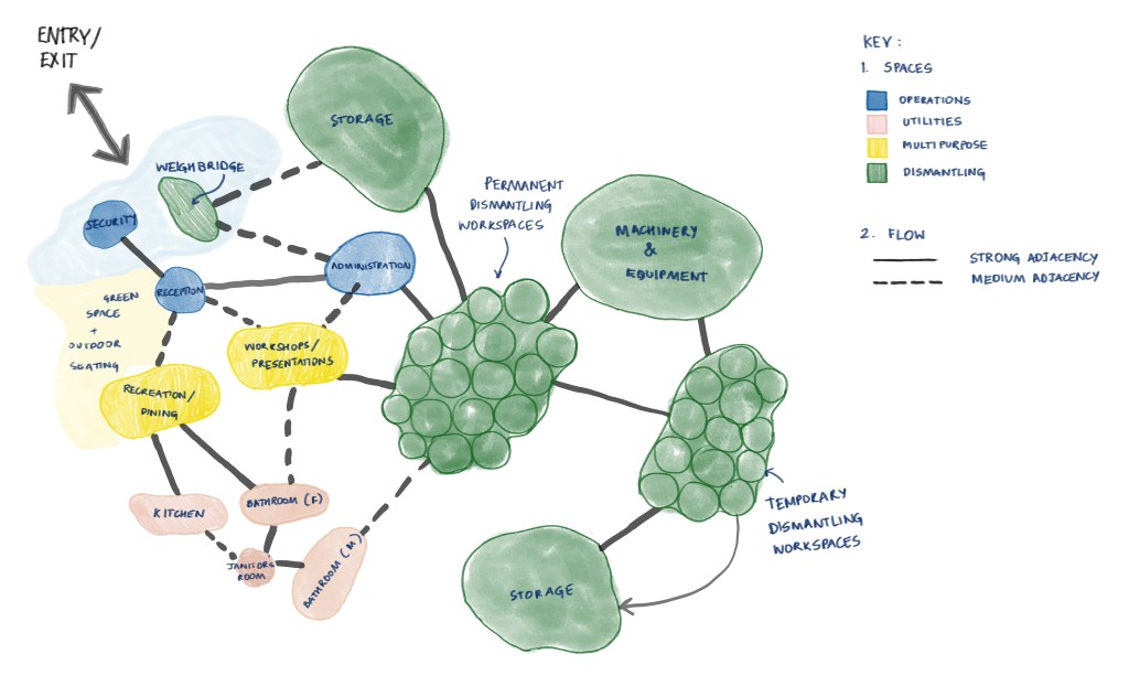 We held a design workshop at a warehouse unit with around fifteen e-waste dismantlers who had their own units. The design workshop was aimed to discuss the current issues faced by the dismantlers and we also facilitated a participatory group activity by asking the e-waste entrepreneurs to reimagine their workspaces. This was done using chalk and tape. The spaces ranged from prayer space to space for the RO, garden area etc. Using these insights we programmed spaces and visualised them to present to the e-waste entrepreneurs.