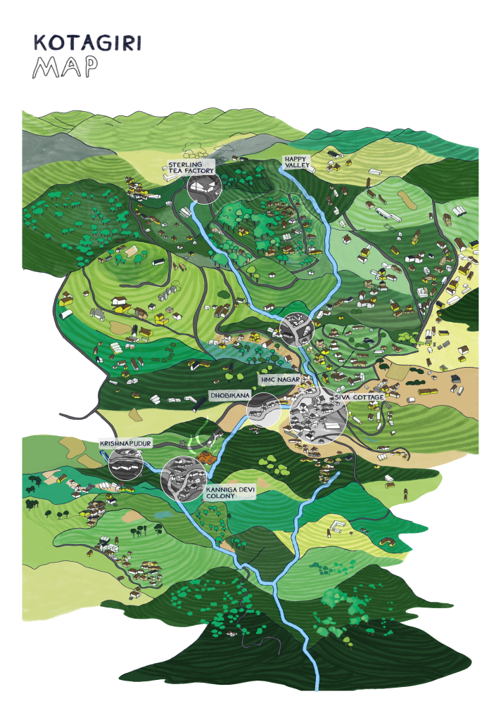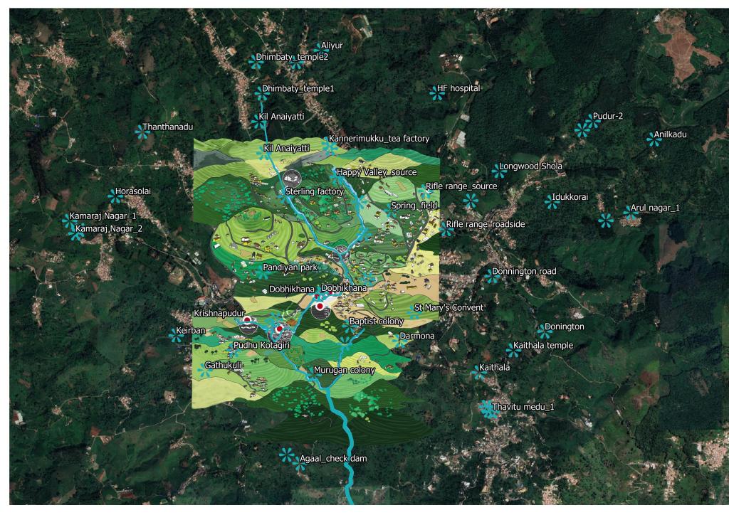 The focus was on two settlements in Kotagiri for the first phase of the project- Krishnapudur and Kannigadevi colony. The household populations of each of the two settlements is approximately 250 and 200 respectively. The two villages Krishnapudur (upstream) and Kannigadevi (down stream) are situated near the Kotagiri-Ooty highway at a 4 km distance from the Kotagiri town. The two settlements are connected through a stream that flows through them. The settlements consist of closely built houses which are congested, and the open drains are filled with grey water, food, plastic, fecal and other stagnating wastes, creating an unpleasant environment. The first level intervention included an illustration map that indicates the key water sources linking it to the two settlements, the land use activities surrounding it, sources of waste polluting the water, communities settled near the water body, their socio-cultural association or linkage to the water body, the key governance arrangements, and the nature of challenges – both felt and perceived through a GIS database. This was followed by creation of awareness and training materials for community based interventions and behavior change .