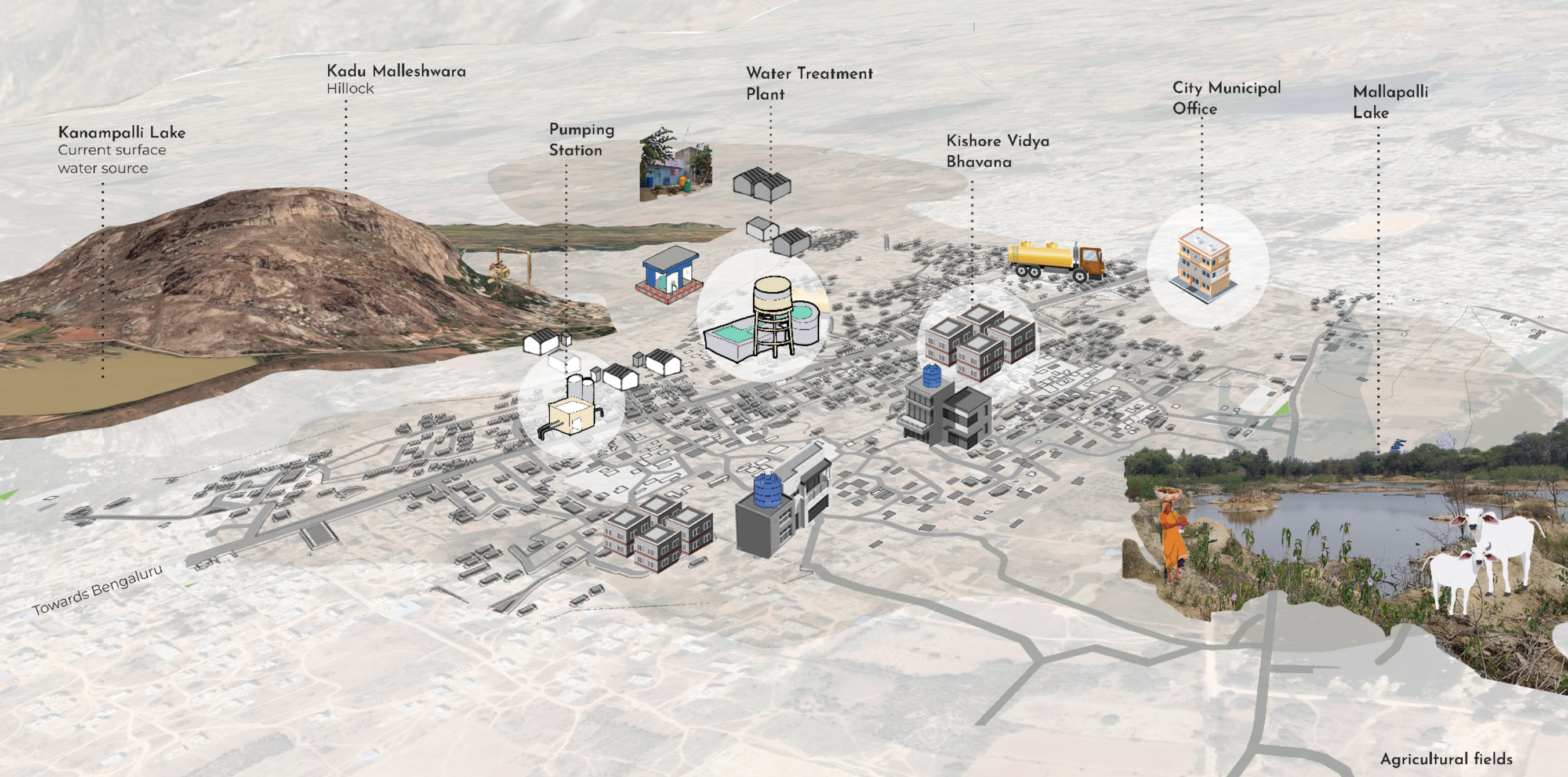 Chintamani town’s drinking water demand is met majorly by groundwater and supported by two surface water sources.