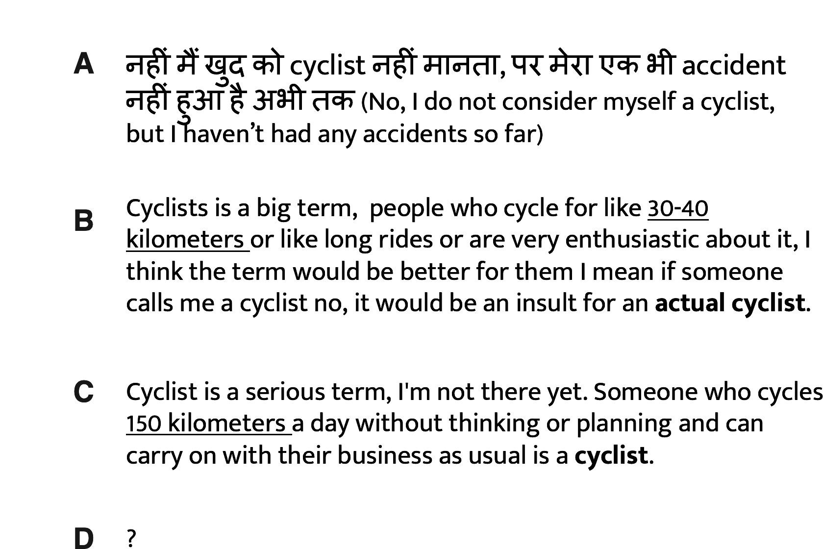 This brings us to the question: Who is a cyclist? From the field – we tried to understand the criteria one has to satisfy to be a ‘cyclist’ along with the diversity of intentions and motivations behind their cycling practices. When we asked our respondents if they consider themselves cyclists, we saw the baseline criteria of a cyclist to be shifting in different user groups; The language imparts obscurity and sense that people consider being a cyclist to be unattainable.