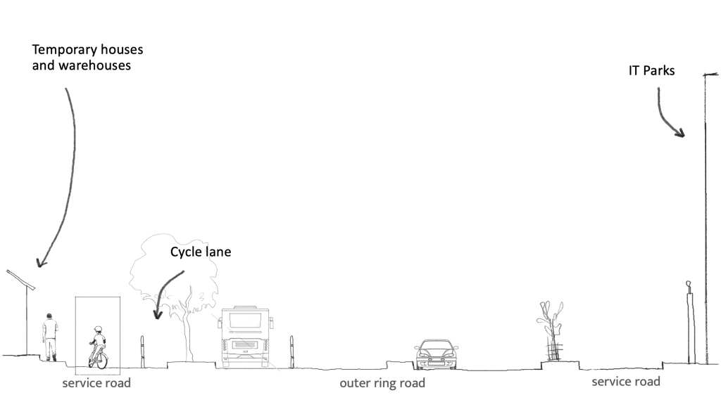 The outer ring road is flanked by the glass paned grade-A office buildings on one side which a lot of riders seem to identify with and on the other side – garages and temporary houses which inhabited the construction workers, security guards and other ancillary service providers. Though a lot of people from the settlement cycle to work, none of them prefer to ride on the designated cycle path.