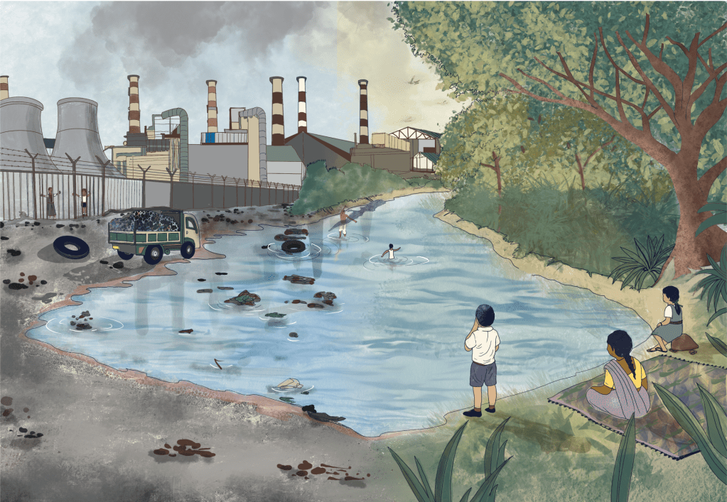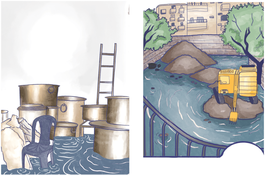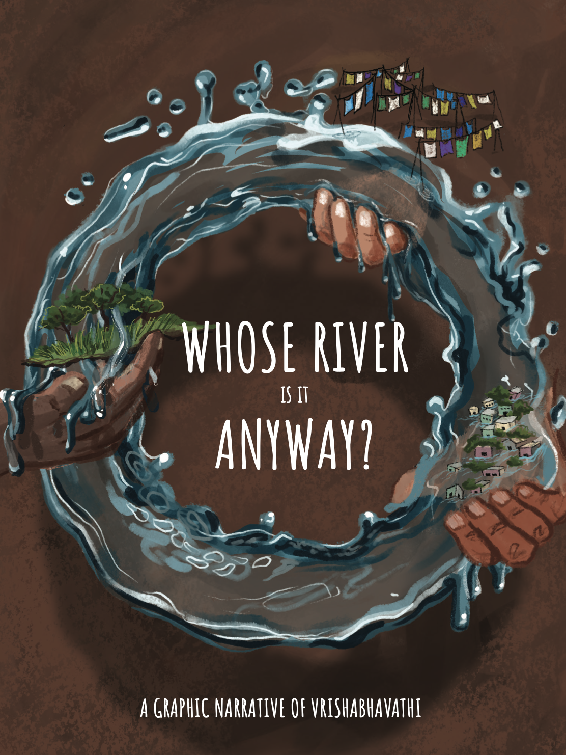 Whose river is it anyway is a collaborative endeavour presented in the form of a graphic collection of stories of an urban river. The book grew from an imagination of the river as an independent being, flowing with agency and with a voice of her own. During the peak of the first COVID wave, in July 2020, we came across an article in the Times of India, with a picture of a relatively clean Vrishabhavathi river. This was a period when the industries in Peenya were not functioning and therefore, not discharging effluents. Our project unbeknownstto us actually began at this point, as a personal journey of understanding what we back then, as young architects, and citizen scientists could do to raise awareness about the river.