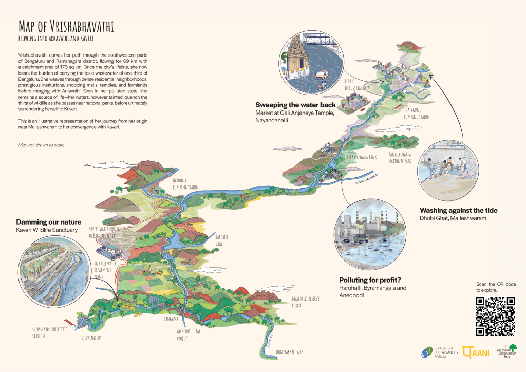 This book is an exercise in countering the dominant representation of rivers being state owned and human-controlled which creates an illusion that if we humans build enough infrastructure, we can conquer the river and break her natural state of being. While the Vrishabhavathi seems to be a river known to only a few in the present day, parallels can be drawn to other urban tributaries that have been relegated to misuse and disuse, marginalising people and dependent biodiversity. We hope that this document will counter this narrative and give a stronger voice to urban waters, by seeing them through eyes that are not just our own – those of beings in these bodies, animals dependent on them to quench their thirst, plants living and dying with their flow and of course the water through her own experiences of being.