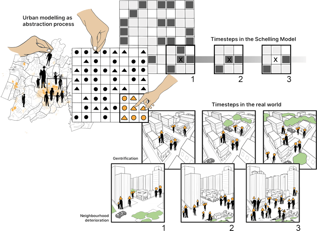 This image introduces the readers to the spatial context wherein we are studying the different ways segregation impacts “agents” – People with multifaceted identities are here modelled as anonymous agents and reduced to single identity lines, such as race, caste or ethnicity. Resources too are gatekept by power brokers who decide how to distribute it and in extension shape policy.